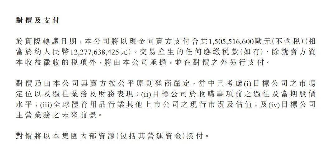 根据公告,于实际转让日期,安踏体育将以现金向卖方支付合共1505516600欧元(不含税)。交易产生的任何应缴税款(如有),除就卖方资本收益征收的税项外,将由安踏体育承担,并在对价之外另行支付。