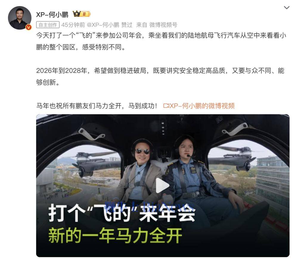 何小鹏称,“今天打了一个‘飞的’来参加公司年会,乘坐着我们的陆地航母飞行汽车从空中来看看小鹏的整个园区,感受特别不同。”