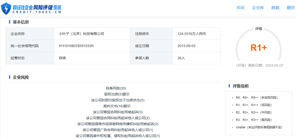 据“网经社企业风险评级系统”显示,小叶子智能陪练隶属于小叶子(北京)科技有限公司的风险评级为R1+,公司目前所处低风险。