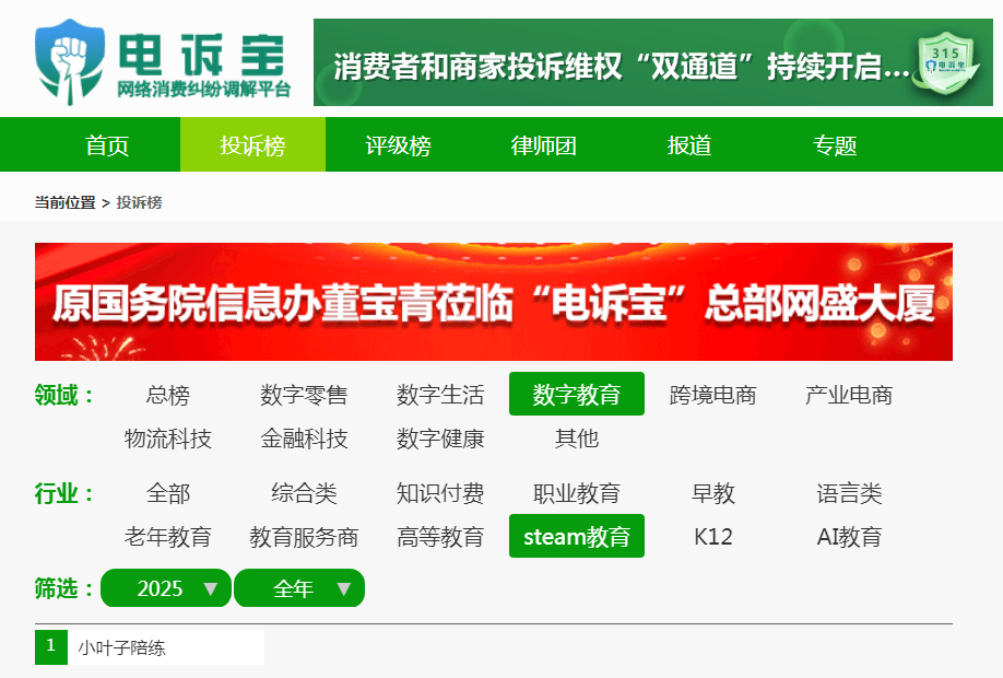 根据“电诉宝”2025年至今受理的在线教育领域用户有效投诉显示(依据投诉量排行),小叶子智能陪练最新评级为“不予评级”。