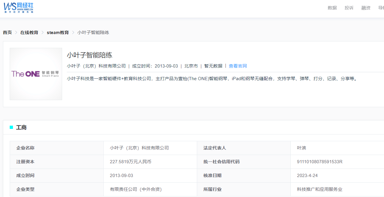 网经社企业库显示,小叶子智能陪练APP是小叶子(北京)科技有限公司推出的一款钢琴陪练应用软件,法定代表人叶滨。