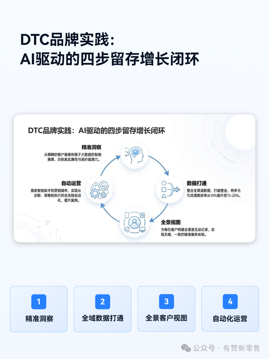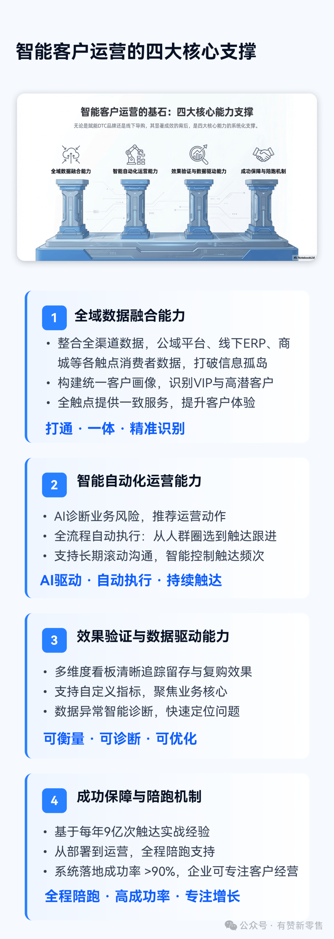 有赞新零售的智能客户运营解决方案在赋能DTC品牌和线下导购方面取得了显著成效,其背后是四大核心能力的系统化支撑。这些能力共同构成了企业提升客户留存、实现可持续增长的技术基石。
