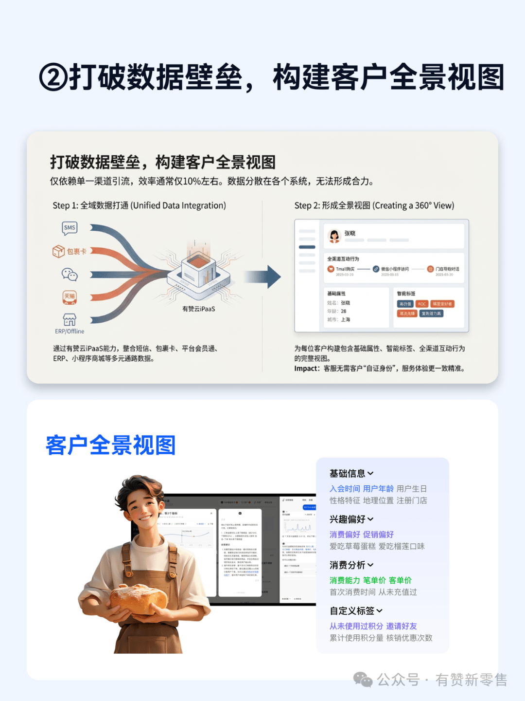 我们通过有赞云iPaaS能力整合企业在公域平台、线下ERP、私域商城等各个触点的消费者数据,构建统一的客户画像。这一能力直接解决了客服响应慢、线下无法识别VIP客户等长期痛点。