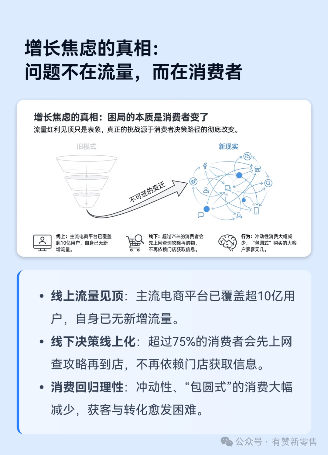 线上,主流电商平台已覆盖超10亿用户,自身已无新增流量;线下,超过四分之三的消费者会先上网查攻略再购物,不再依赖门店获取信息。