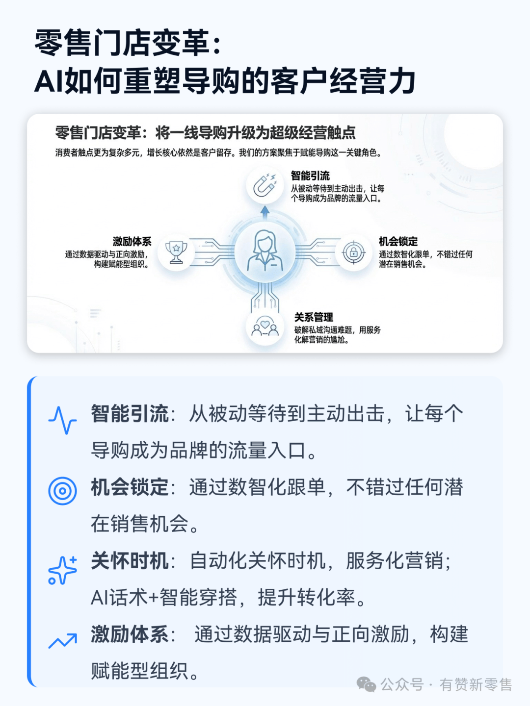 有赞新零售针对门店的解决方案,聚焦于赋能导购这一关键角色,通过智能化工具重塑其引流、识别、互动与激励的全流程,将传统导购转变为品牌客户经营的超级触点。