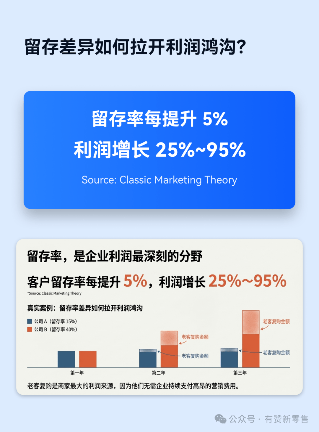 面对这一变局,核心破局点在于客户留存。经典营销理论指出,客户留存率每提升5%,利润便能增长25%~95%。