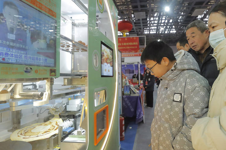 舌尖年味区一角,一台煎饼机器人正有条不紊地舀面糊、摊饼、加配料,动作娴熟流畅,不一会儿,金黄酥脆的煎饼就出锅了。“这个煎饼机器人太有意思了,做出来的煎饼和手工的一样好吃,还干净卫生,我买两个尝尝鲜,也给家里人带一份。”王清芳拿着刚做好的煎饼笑着说。