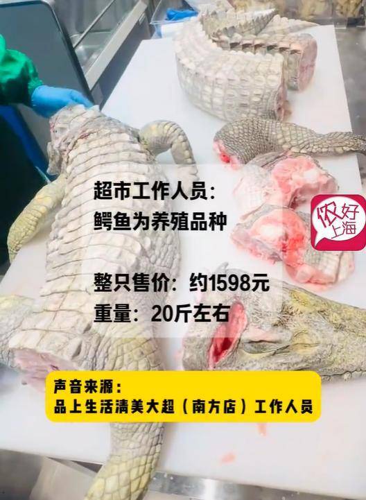 近日,有网友发帖称在上海品上生活清美大超(南方店)内,工作人员直接把整条鳄鱼分切售卖。据现场画面显示,超市内有工作人员进行鳄鱼切分处理,一旁摆放着已切开的鳄鱼尾巴。不同部位每斤售价59.9元至99.9元不等。超市工作人员透露,所售鳄鱼为人工养殖,整只出售价格约为1598元,单只鳄鱼重量一般在20斤左右。