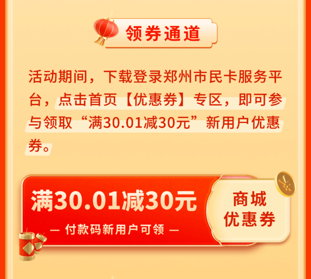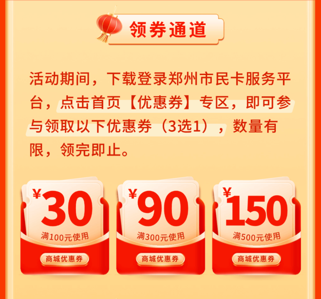 活动期间,自1月28日至2月1日,每日上午10点,郑州社保卡(市民卡)用户(含省直用户)可通过“郑州市民卡”APP领取优惠券。券面分为三档: “满500元减150元”“满300元减90元”“满100元减30元”,每人限领一张(三选一)。成功领券后,在市民卡商城线上购物即可享受对应满减优惠。
