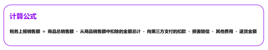 税务上报销售额 = 商品总销售额 - 从商品销售额中扣除的金额总计 - 向第三方支付的扣款 - 损害赔偿 - 其他费用 - 退货金额;