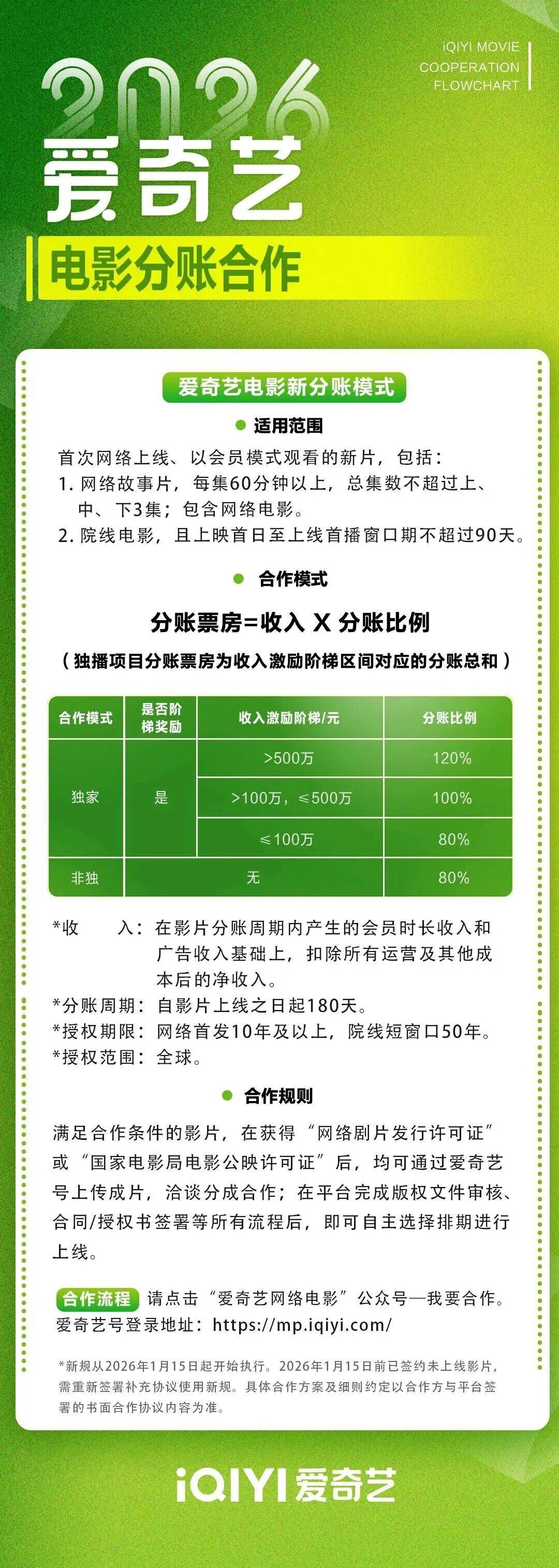 主编温静导读:在众多平台中,爱奇艺的分账规则升级尤为引人注目。不同于其他平台分业务“散点式”升级的思路,爱奇艺一次性将电影、剧集、微剧、漫剧、动漫、少儿、纪录片、知识八大业务板块的分账规则统一升级为“收入分账”模式。这套将于2月1日实施的新规,简单明了,直接让内容价值与商业回报的挂钩,将给行业生态带来深层变革。
