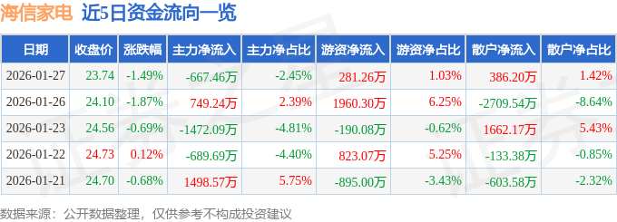 证券之星消息,截至2026年1月27日收盘,海信家电(000921)报收于23.74元,下跌1.49%,换手率1.24%,成交量11.41万手,成交额2.72亿元。