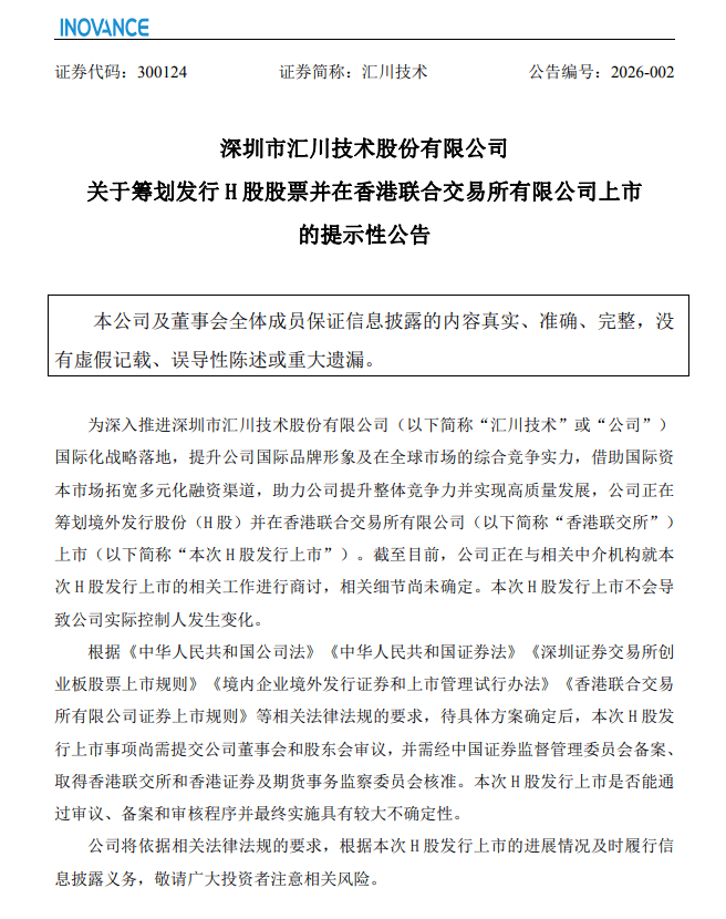 1月19日,汇川技术(300124.SZ)公告称,为推进国际化战略,提升国际品牌形象和全球市场竞争力,公司正筹划境外发行股份(H股)并在香港联交所上市。目前,公司正与中介机构商讨相关工作,细节尚未确定。此次H股发行上市不会导致实际控制人变化。方案确定后,需提交公司董事会和股东会审议,并需经中国证监会备案、香港联交所和香港证监会核准。该事项存在较大不确定性。公司将依法披露进展情况,提醒投资者注意风险。