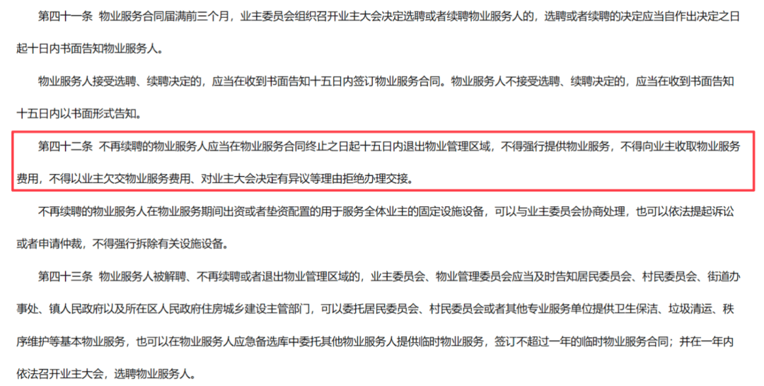 另据《佛山市住宅物业管理条例》第四十二条,不再续聘的物业服务人应当在物业服务合同终止之日起十五日内退出物业管理区域,不得以对业主大会决定有异议等理由拒绝办理交接。