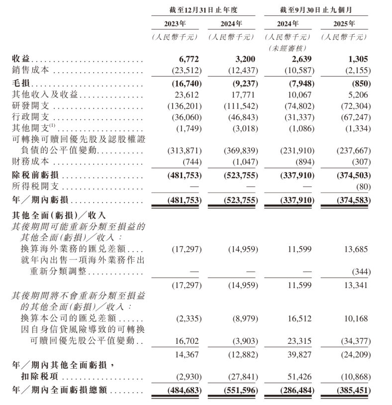 招股书显示,2023年、2024年及2025年1-9月,亦诺微实现营业收入677.2万元、320万元、130.5万元,期内全面亏损总额分别为4.85亿元、5.52亿元以及3.85亿元。亦诺微长期处于亏损状态。
