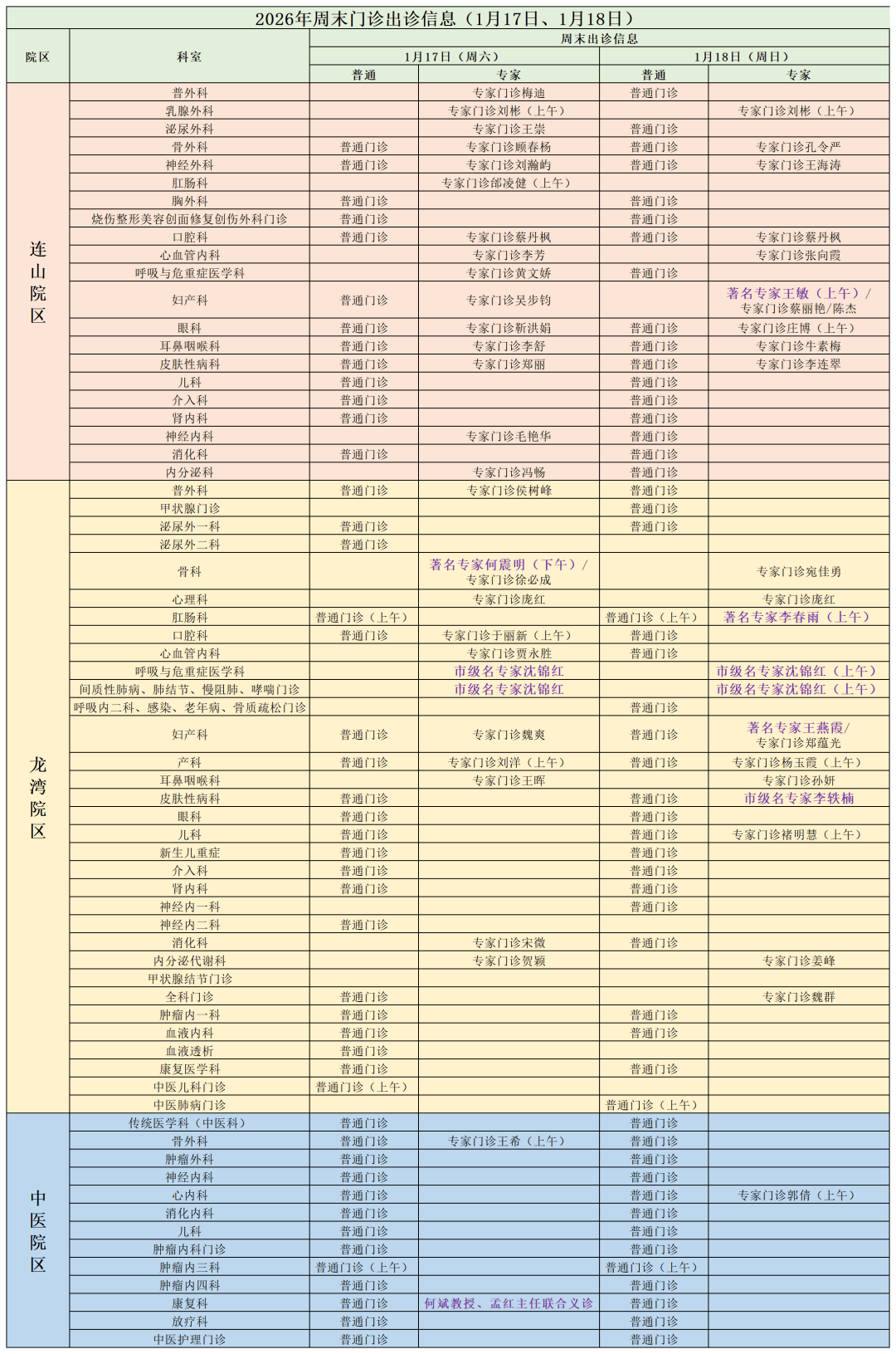 注:1.如因特殊情况排班表中医生不能出诊,以当天实际出诊医生为准;