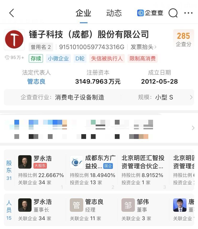 企查查显示,锤子科技(成都)股份有限公司成立于2012年5月,法定代表人管志良,注册资本约3150万元,由罗永浩任董事长并持股22.67%。