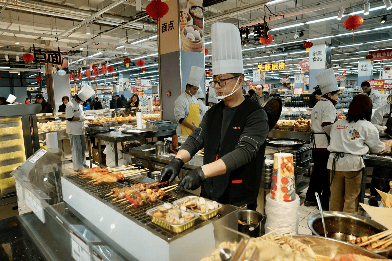 以酱卤区为例,该区域天南地北的风味轮番登场。中式区域的凉拌卤味色泽诱人,酱牛肉、无骨凤爪、酱大骨,每一款都是佐餐下酒的不二之选;日式档口精致吸睛,现点现切的三文鱼鲜美嫩滑,用料扎实的寿司一口一个超满足。现烤现串的羊肉串、牛肉串滋滋冒油,撒上一把孜然辣椒面,肉香混着炭火香,让路过的顾客忍不住停下脚步;外酥里嫩的酱香饼、肉蛋堡刚出炉就被抢空。这份触手可及的温暖与扑面而来的烟火气,正将超市从单纯的购物场所,转变为社区生活的新节点。