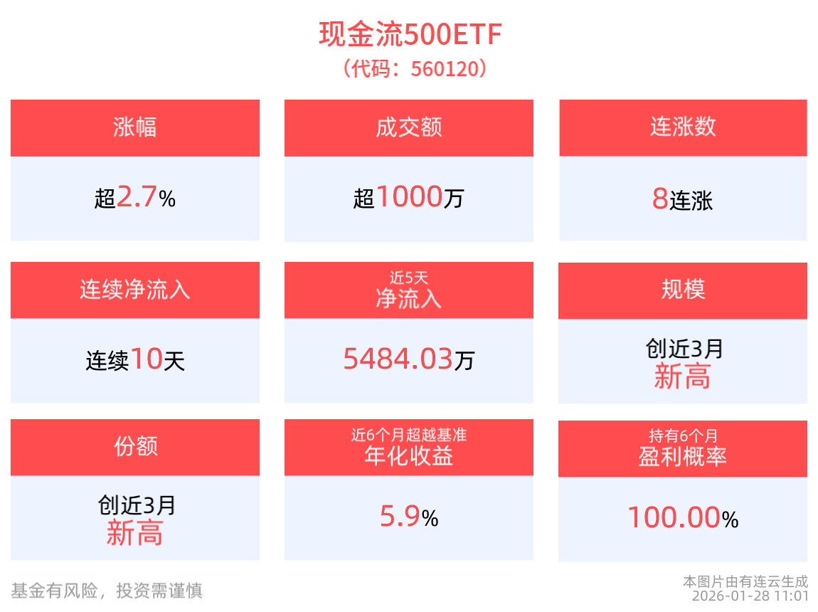 截至2026年1月28日11:01,中证500自由现金流指数强势上涨2.5%,成分股白银有色、浙江龙盛涨停,华峰化学、锡业股份、金诚信等个股跟涨。现金流500ETF(560120)上涨2.79%, 冲击8连涨,最新价报1.48元。流动性方面,现金流500ETF盘中换手11.55%,成交1524.44万元,市场交投活跃。从资金净流入方面来看,现金流500ETF近10天获得连续资金净流入,合计“吸金”7990.79万元。