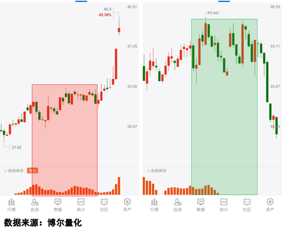 三、反复震荡的背后,藏着资金态度再看这组对比,左侧标的反复震荡,「机构库存」始终活跃,说明机构资金一直在持续布局,最后标的走势不断走高;右侧标的震荡中「机构库存」逐渐消失,哪怕拉出亮眼的阳线,也只是短线资金的短期动作,根本无法持续,没多久就一路走低。