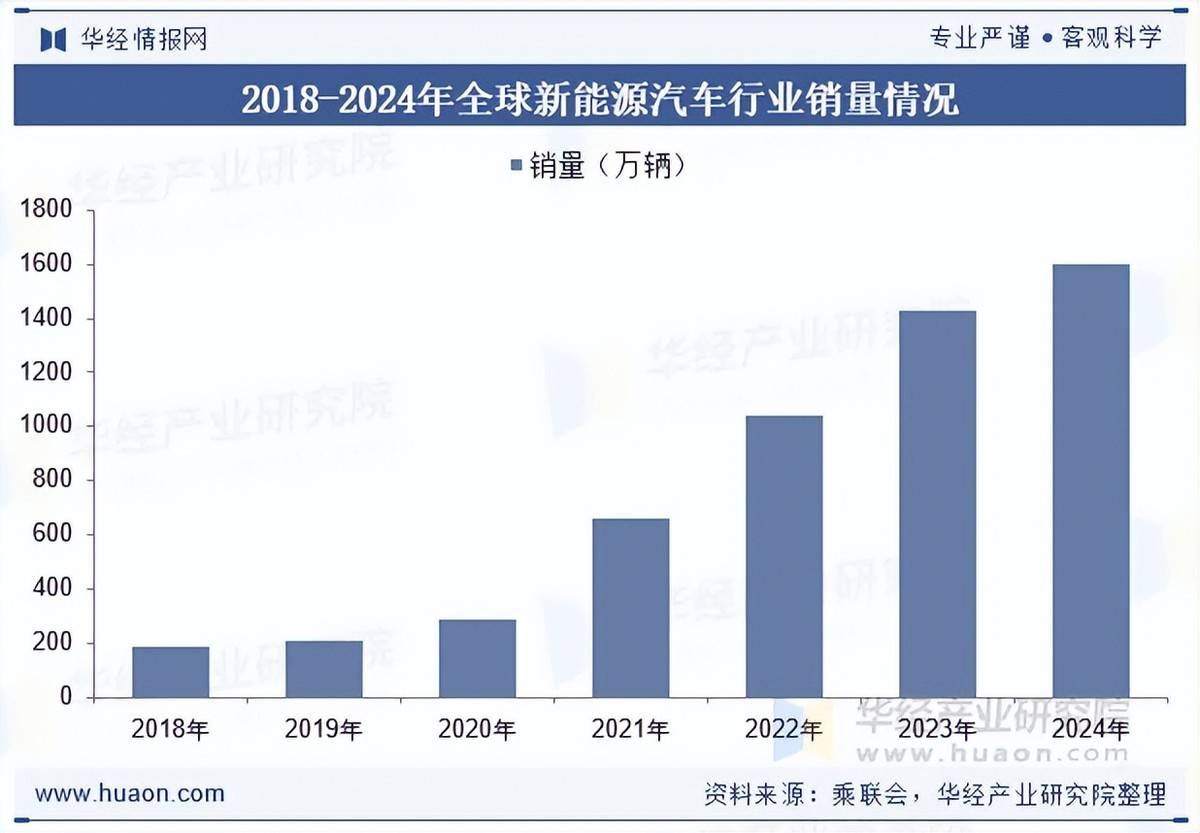 全球新能源汽车市场呈现显著增长态势,其销量规模持续扩张已形成明确发展趋势。尤其在2020年之后增速显著加快。2018年全球新能源汽车销量为189万辆,到2024年已达到1603万辆,显示出强劲的市场扩张势头。其中,2021年销量达到约658万辆,同比增长达到130.88%,为近年来最高增幅;随后增速有所放缓,但整体仍保持高位增长。