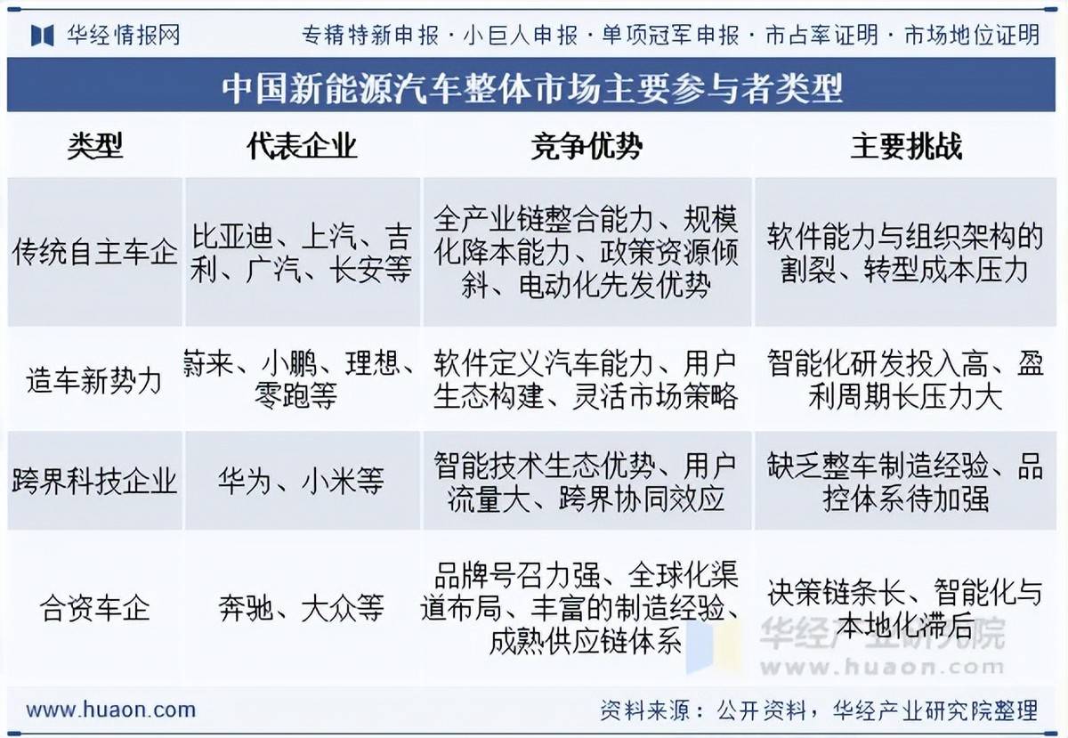 在中国新能源汽车整车市场中,主要有四类企业参与竞争。首先是传统自主车企,凭借其成熟的制造体系、供应链管理能力和广泛的销售渠道,积极向新能源汽车领域转型,其中比亚迪、上汽、吉利、广汽、长安等是典型代表。其次是造车新势力,这些企业以用户需求为核心,专注于智能化和创新服务,蔚来、小鹏、理想、零跑等是其代表。第三类是跨界科技企业,它们以智能驾驶和车联网技术为切入点,通过生态协同来提升用户体验,华为、小米等是这一领域的代表。最后是合资车企,它们凭借显著的品牌溢价、全球化的布局以及深厚的技术积累参与市场竞争,例如奔驰、大众等。