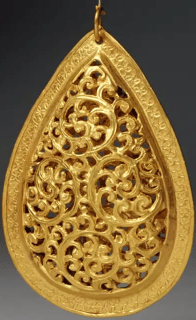 在服饰材料方面,湖州锦已驰名,甚至可与“蜀锦”媲美。宋代的天圣至嘉祐年间,湖州丝印染技术已达较高水平,能印染出深红、浅红、淡红等色彩,其精美与玛瑙缬不分上下,称为“湖缬”。此法甚至被四川蜀锦所仿效。在《蜀锦谱》中记载:“蜀中锦有真红湖州大百花孔雀锦,有四色湖州百花孔雀锦,有二色湖州大百花孔雀锦”。此外,宋代湖州先民使用的配饰也随着三天门南宋墓的挖掘而展现在我们的面前,以两块菱形对角互叠形成的金叠胜耳环和一枚缠枝卷草纹金帔坠,可以看到不规则几何纹主要作为饰品造型出现在首饰中,精美的花纹和精湛的技艺折射出江南地区的审美升级与商贸繁荣。