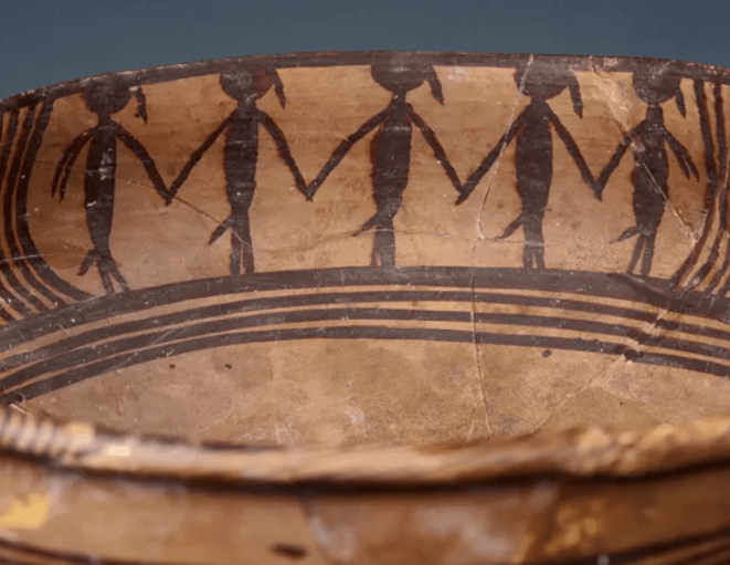 剪影舞蹈人物纹彩陶。从人物剪影的垂饰推断,这些人似乎穿着下摆齐膝、臀后垂尾的兽皮衣。