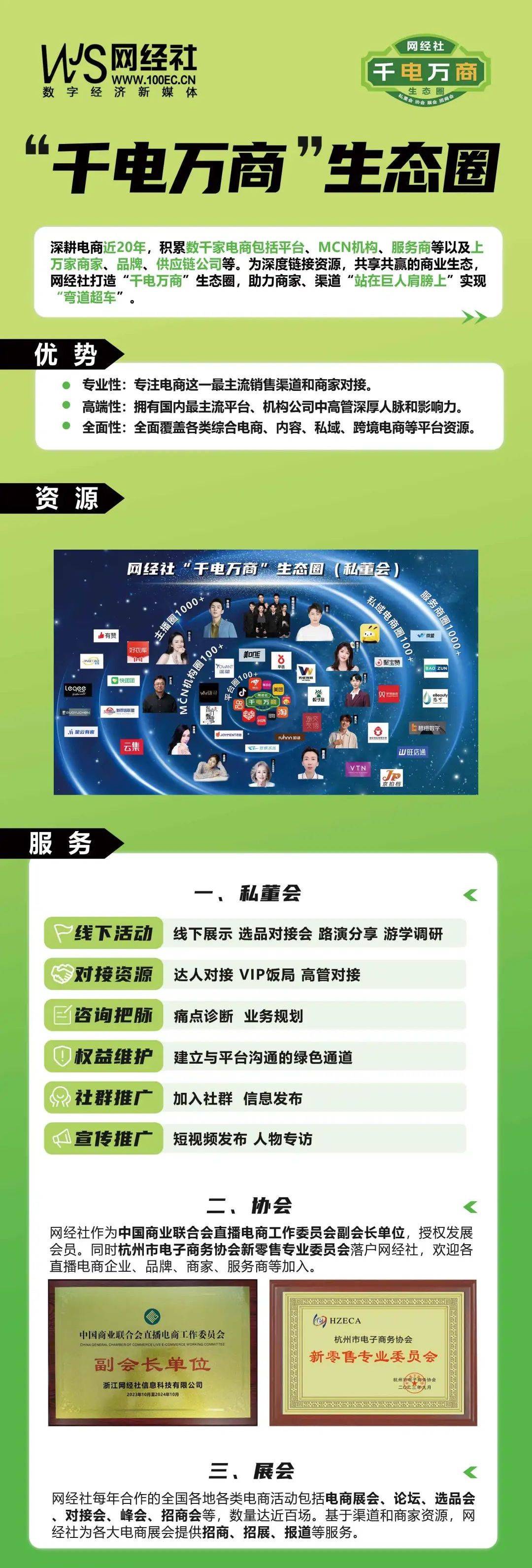 4.私董会: 网经社“千电万商”生态圈服务,面向各类电商渠道方、品牌方、商家和供应链公司提供资源对接服务,扮演了行业“育苗人”的角色 。