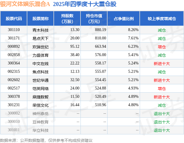 银河文体娱乐混合A的前十大重仓股如下: