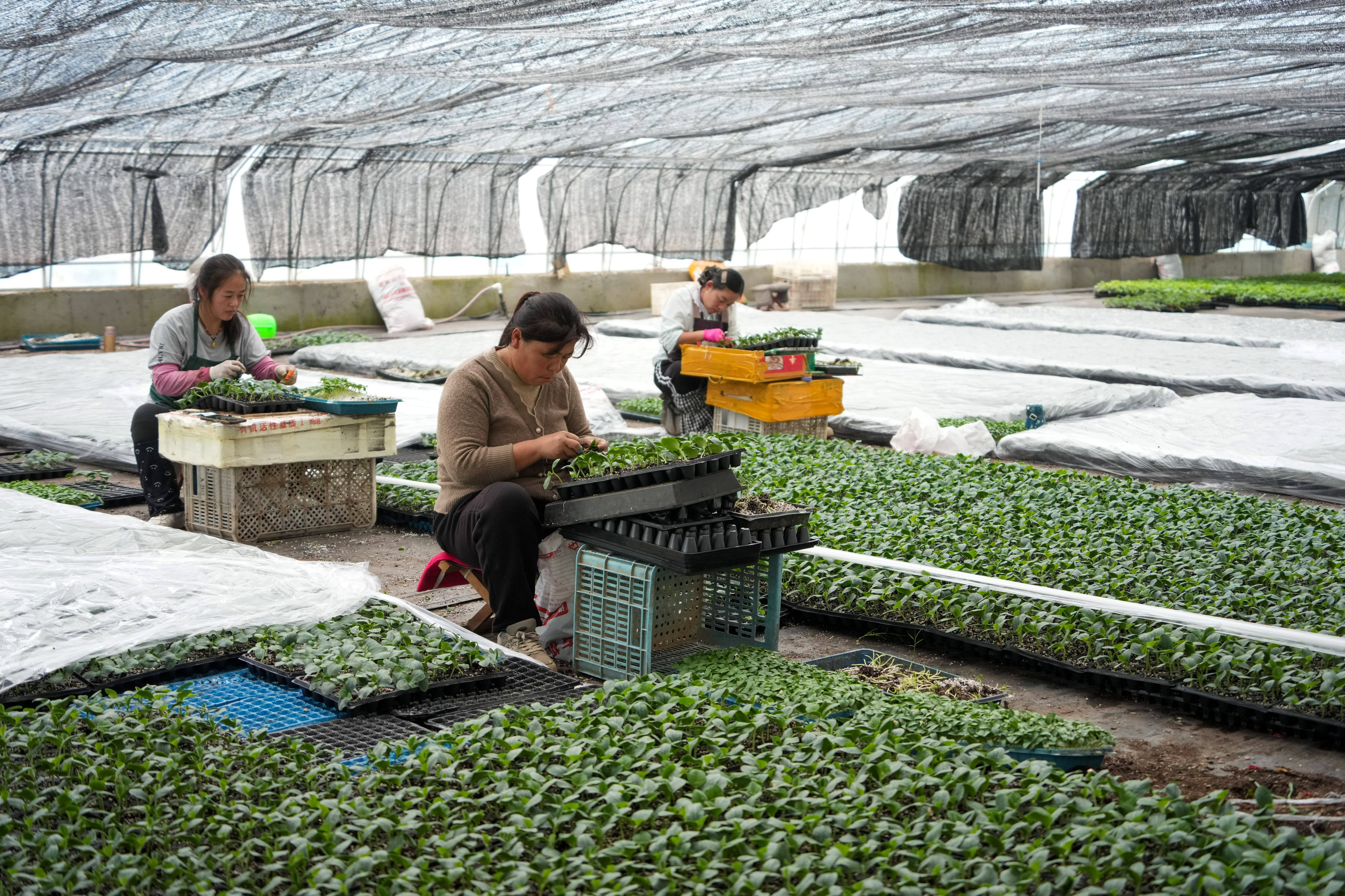 1月28日,在莘县董杜庄镇的蔬菜种植大棚,农户在进行大棚蔬菜种苗嫁接工作。 新华社记者 徐速绘 摄