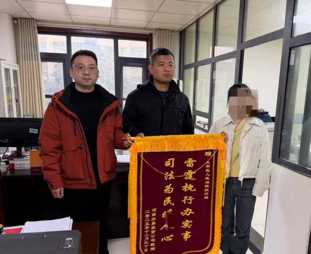 扣除预留生活费后,剩余的5.6万元执行款被及时划转至法院执行款专户。执行干警随即联系申请执行人河南某投资公司,告知其款项到账情况,并协助其快速办理款项领取手续。企业负责人拿到执行款的同时,也送来了一面印有“雷霆执行办实事 司法为民暖人心”的锦旗,对上街法院高效执行深表感谢。