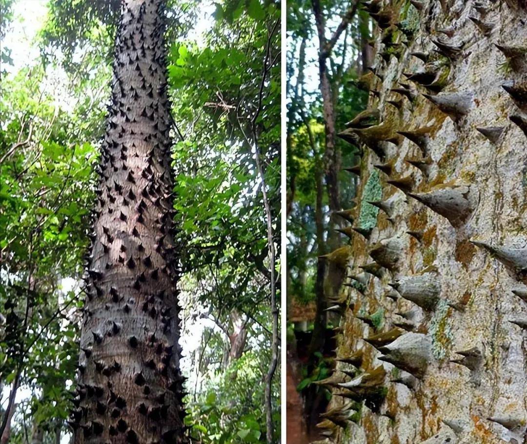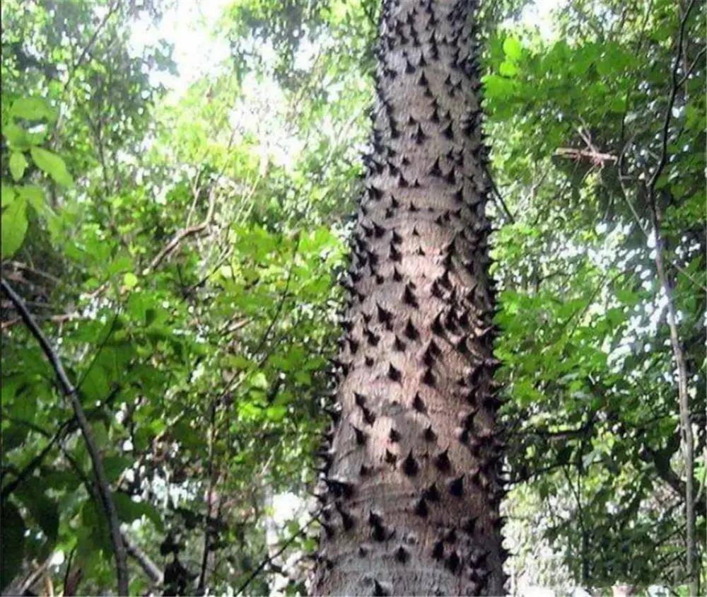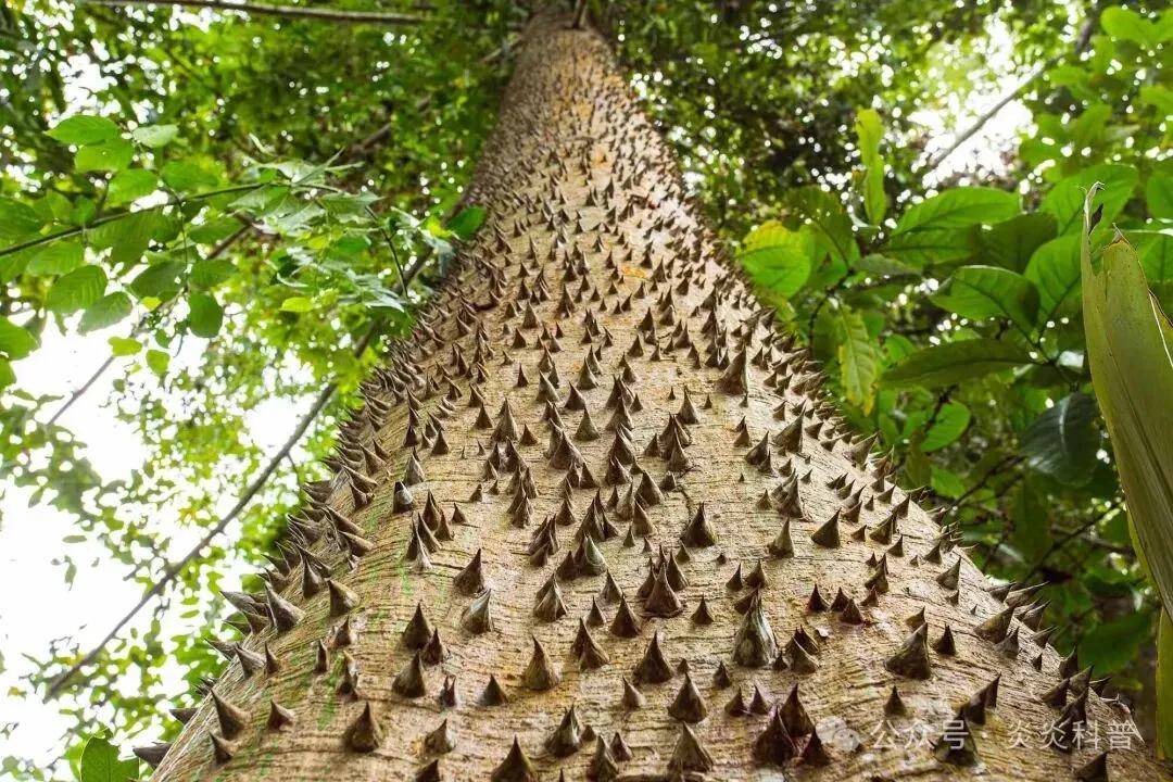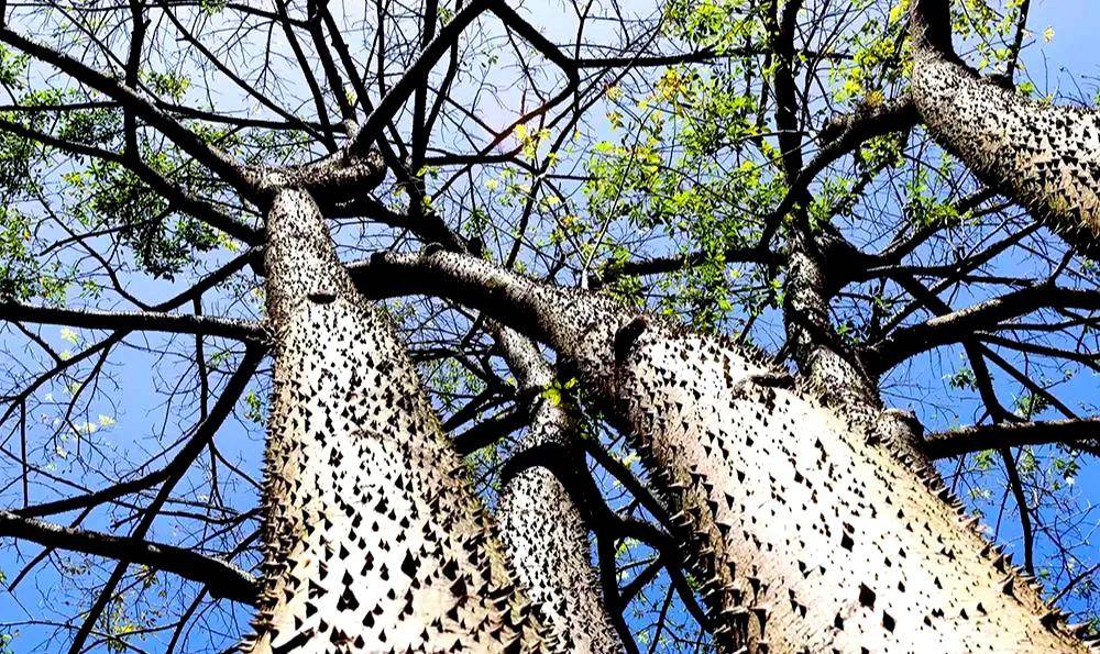 无需近距离靠近,就能清晰看到它的树干上布满了密密麻麻的圆锥形尖刺,这些尖刺虽不算修长,却异常坚硬粗壮,每根尖刺的锥底直径堪比一枚五毛硬币,触感粗糙锋利,稍不留意就会被划伤。