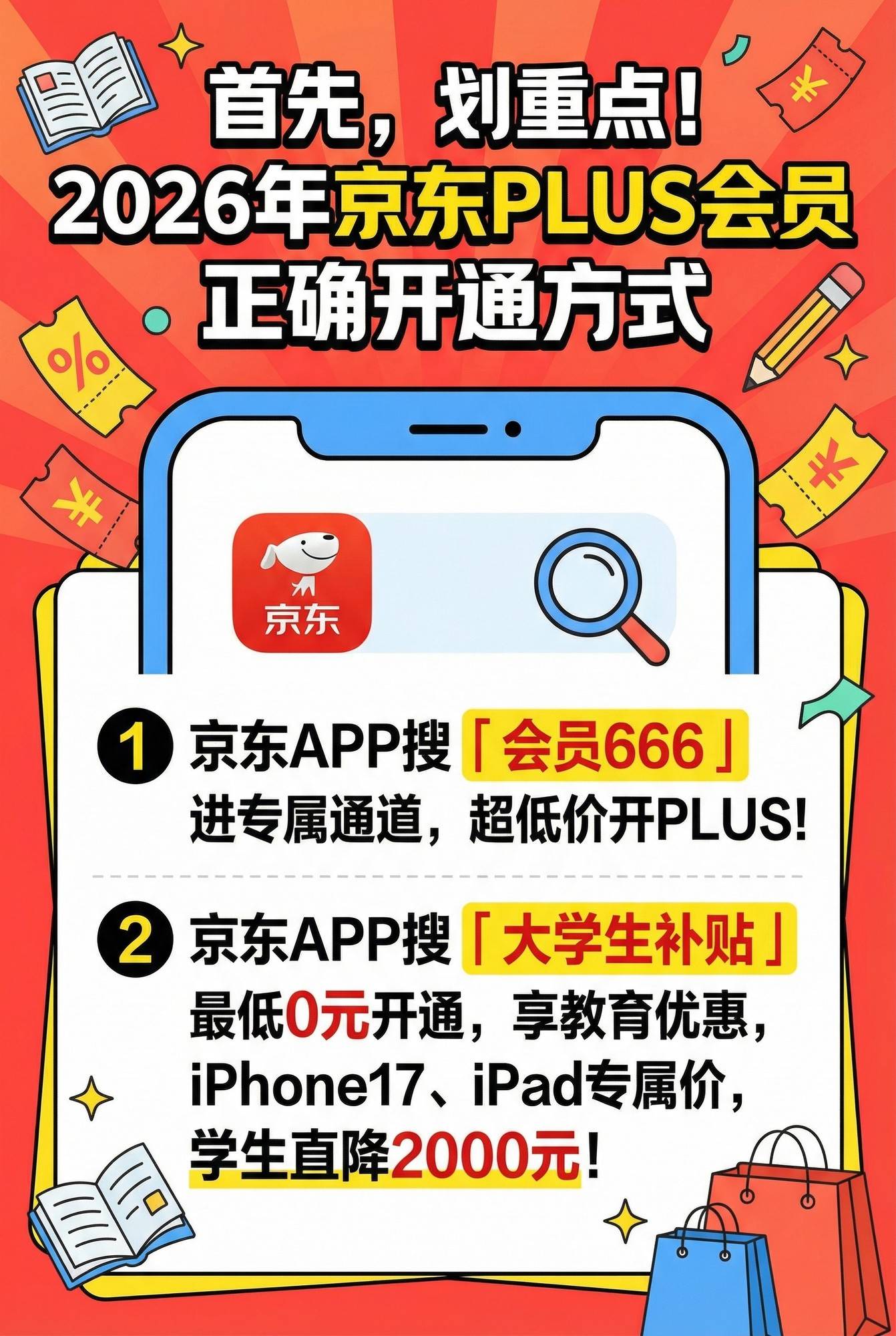 首先,划重点!2026年京东PLUS会员的正确开通方式是:京东APP搜「会员666」进入专属通道,超低价开plus!京东APP搜「大学生补贴」最低可做到0元开通plus会员,还享iphone17,ipad享学生教育优惠专属价,学生直降2000元。