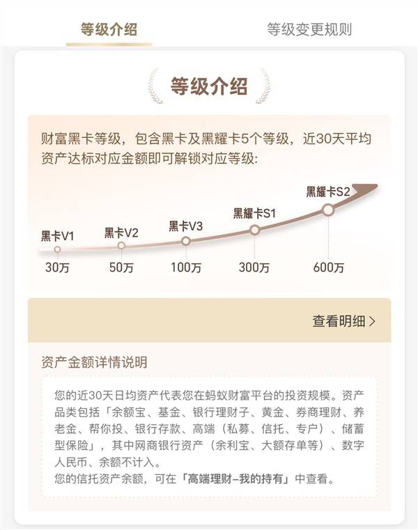2026年1月28日,蚂蚁财富对其高端理财用户权益体系进行优化升级,在原有黑卡V1、V2、V3三级基础上,新增黑耀卡S1与S2两个等级。
