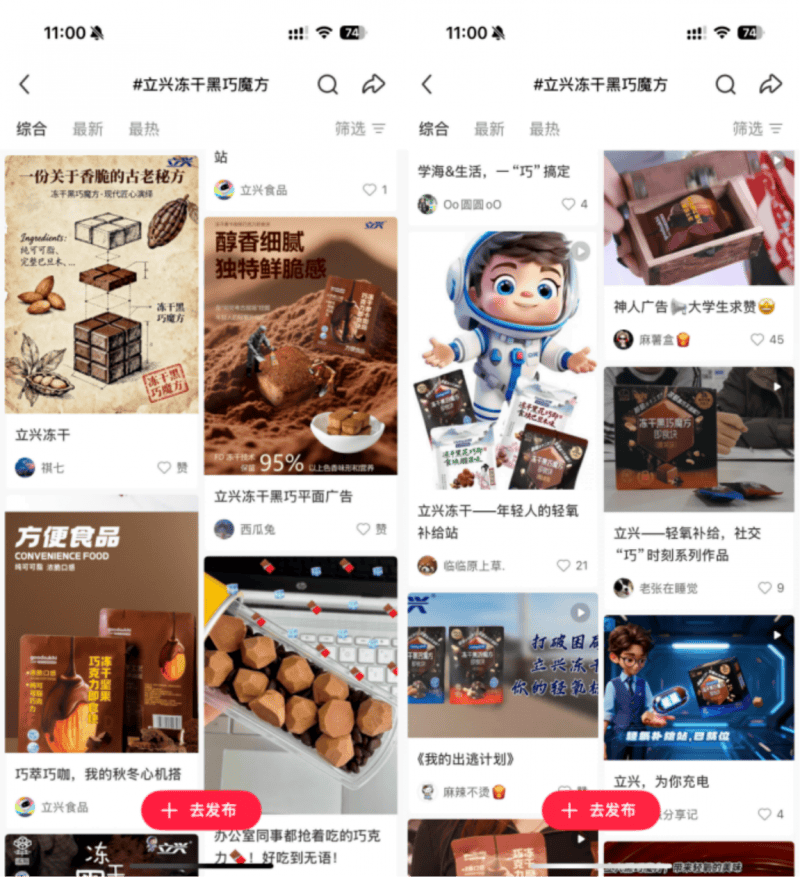 如果说行业奖项是专业层面给出的高分,那么在小红书上自然生长的内容,就是市场用真实行为写下的评语。一个品牌是否真的被年轻人接纳,最直观的证明就是看它能否从被动的传播对象,转变为年轻人主动分享的生活主角。立兴冻干没有采用传统的硬广轰炸,而是以#立兴冻干黑巧魔方和#年轻人的轻氧补给站两大话题为引,成功激发了年轻人的创作与分享欲。