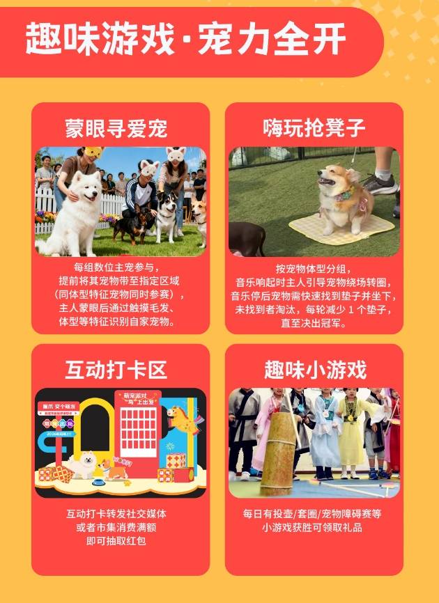 本次活动突破传统消费场景,精心策划四大主题板块,提升市民参与感与街区文化内涵:“萌宠社交派对”:设置宠物趣味游戏、专业义诊、互动抽奖,打造友爱温馨的宠物社交平台。