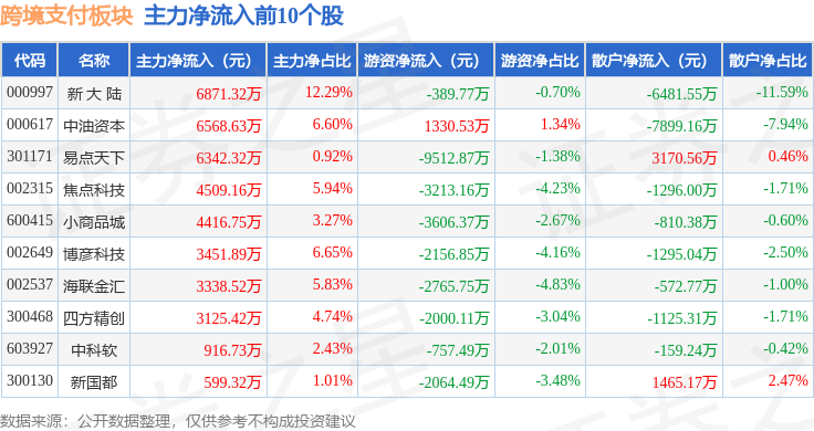 从资金流向上来看,当日跨境支付板块主力资金净流出2.49亿元,游资资金净流出3.75亿元,散户资金净流入6.25亿元。跨境支付板块个股资金流向见下表: