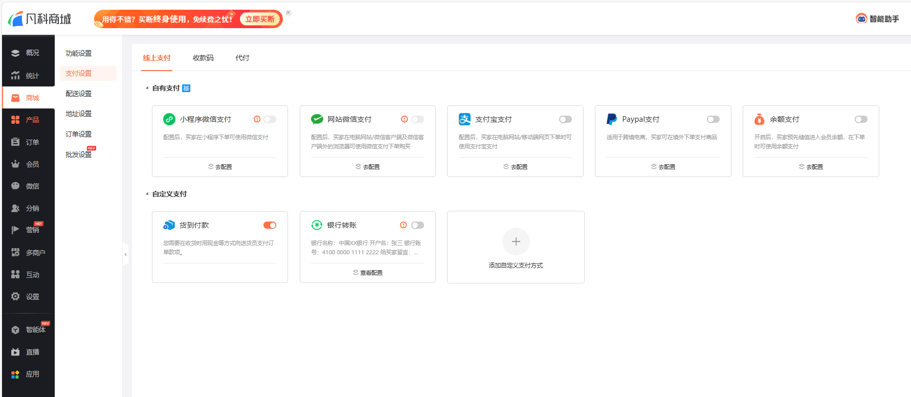 装修完门店之后,我们进入管理后台,点击“商城”-“支付设置”标签页,我们可以选择“线上支付”“收款码”“代付”三种方式。这里支持微信支付、支付宝支付、Paypal支付、银行转账等多种主流支付方式,我们选择一款你中意的支付方式,点击下方的“去配置”,顺着指引操作,就可以完成对支付方式的配置啦~