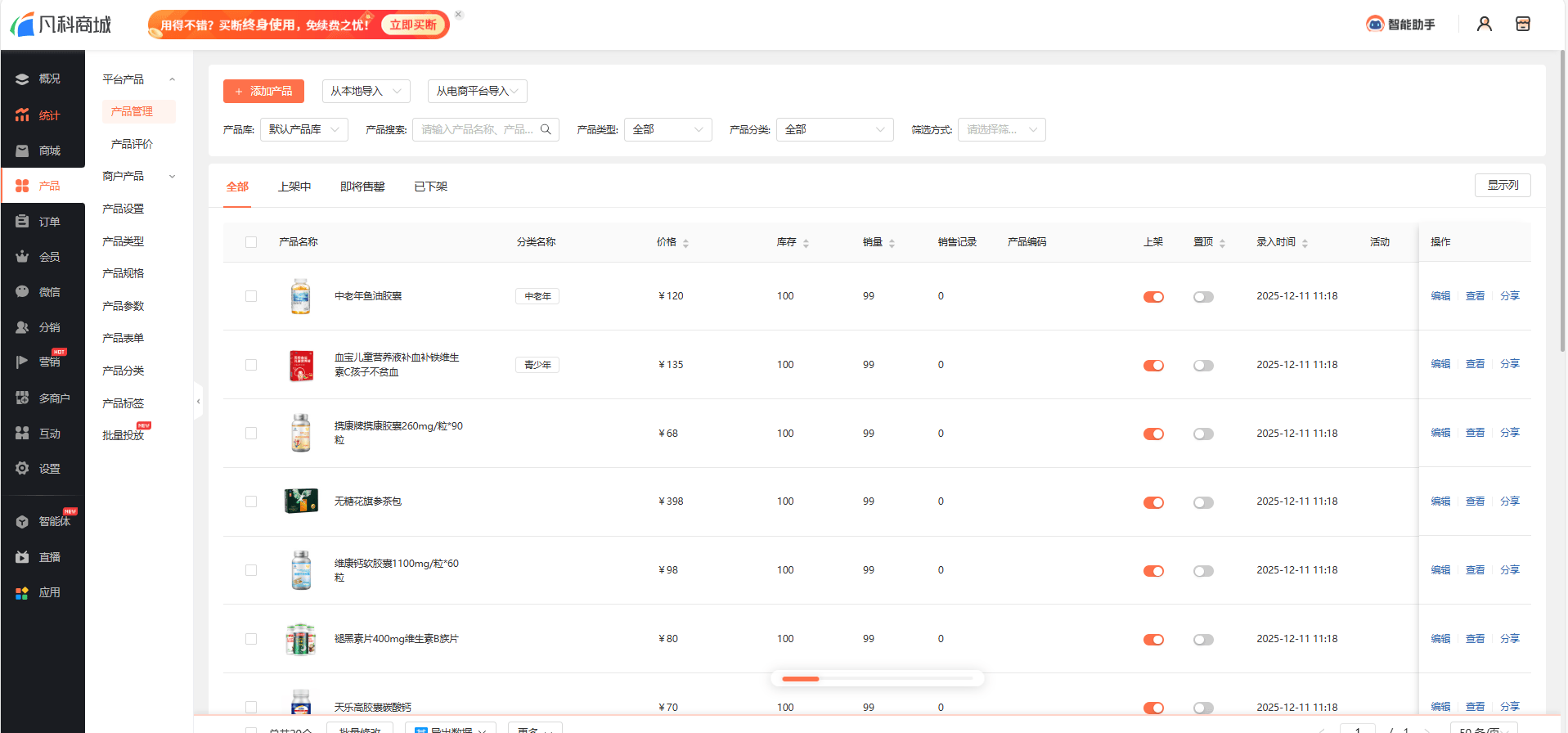 点击“产品”-“产品管理”标签页,再点击左上角的“添加产品”,选择产品的类型,输入产品名称、卖点描述并上传产品图片和主图视频,就可以添加产品啦。