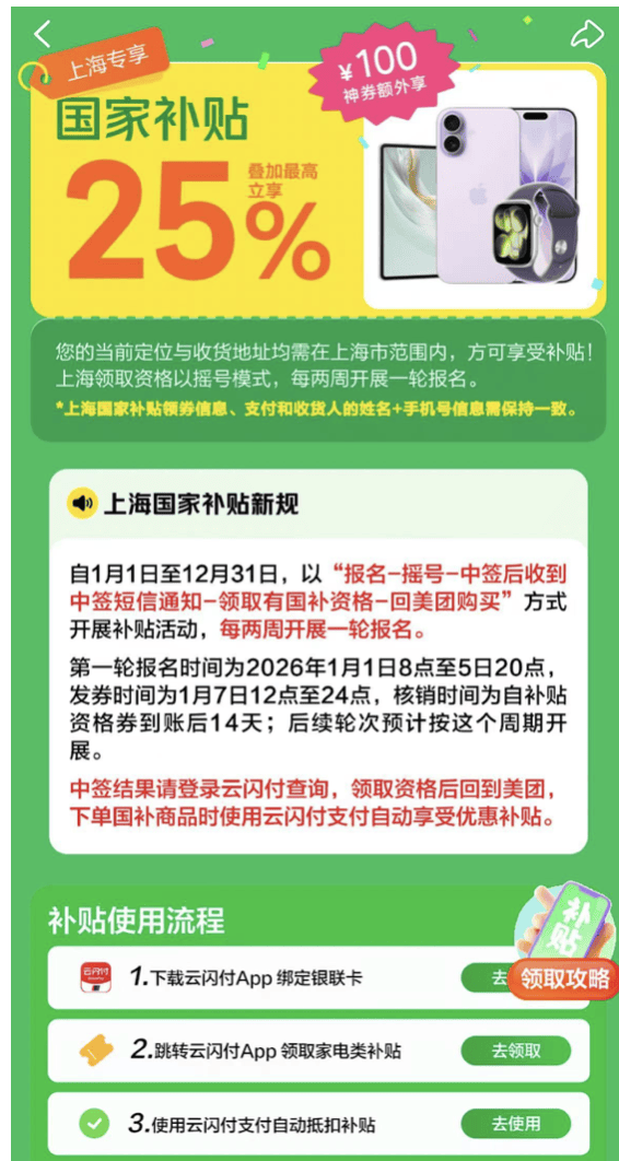 针对数码发烧友和年货礼赠需求,美团闪购联合华为、苹果、小米等主流品牌门店于1月28日起在上海正式上线新一轮国补优惠,将数码产品的“即时送达”推向新高度。
