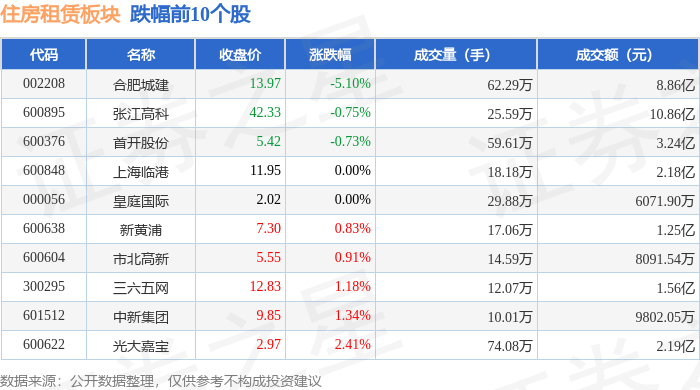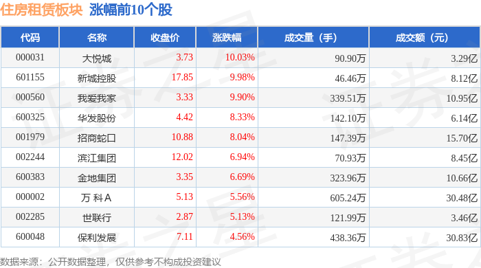 证券之星消息,1月29日住房租赁板块较上一交易日上涨4.56%,大悦城领涨。当日上证指数报收于4157.98,上涨0.16%。深证成指报收于14300.08,下跌0.3%。住房租赁板块个股涨跌见下表: