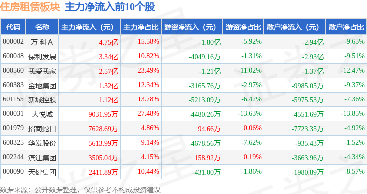 从资金流向上来看,当日住房租赁板块主力资金净流入14.72亿元,游资资金净流出5.73亿元,散户资金净流出8.99亿元。住房租赁板块个股资金流向见下表: