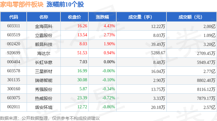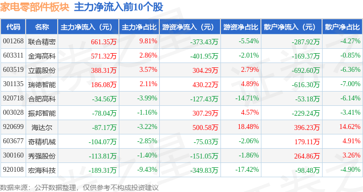 从资金流向上来看,当日家电零部件板块主力资金净流出15.3亿元,游资资金净流入2.08亿元,散户资金净流入13.22亿元。家电零部件板块个股资金流向见下表: