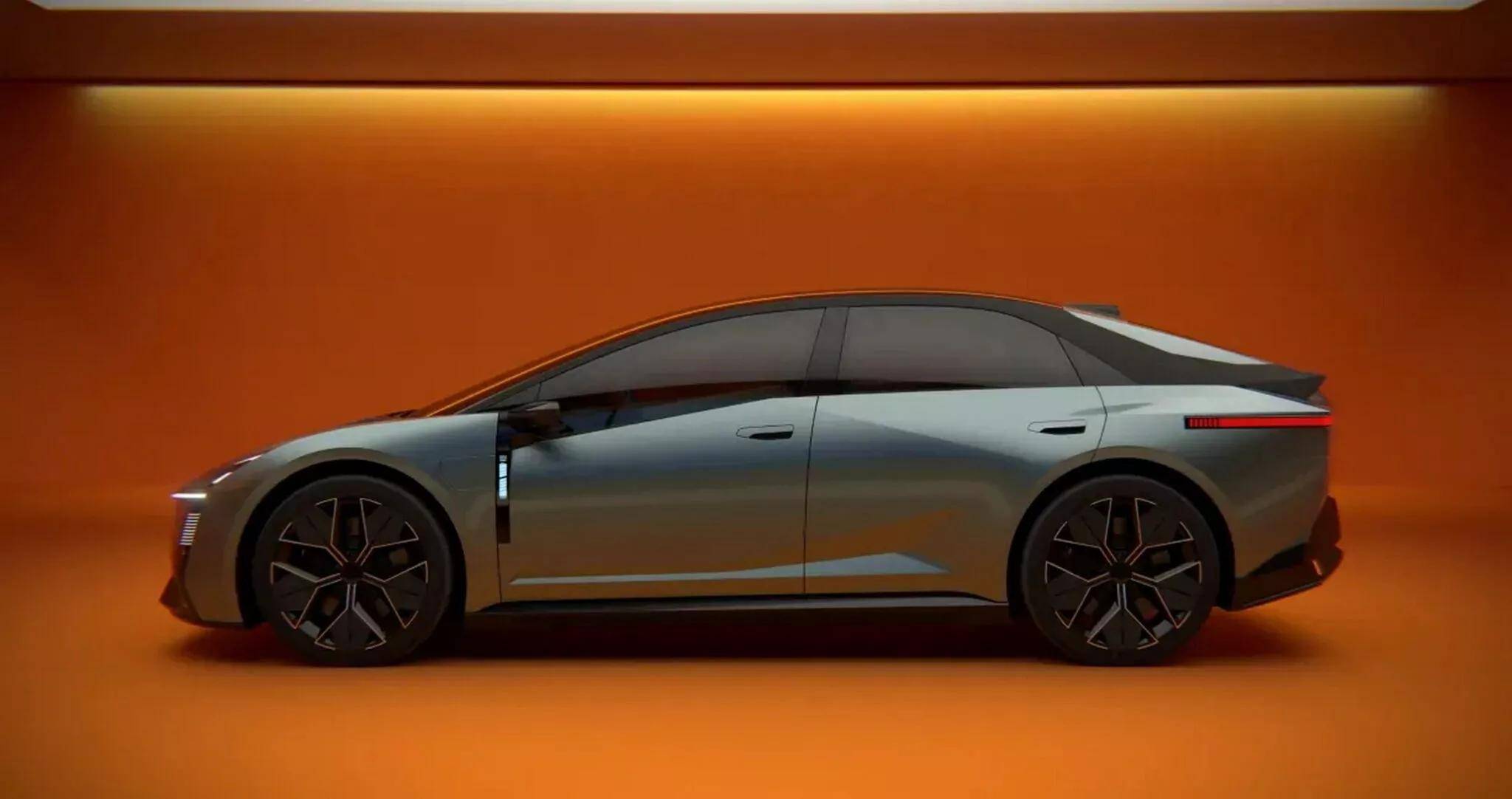 车身侧面,概念车低矮的引擎盖、极具科幻感的车顶线条均做了大幅柔化调整,搭配尺寸更贴合家用的轮毂与传统车门把手,不过依旧保留了概念车复杂且富有动感的车身腰线。