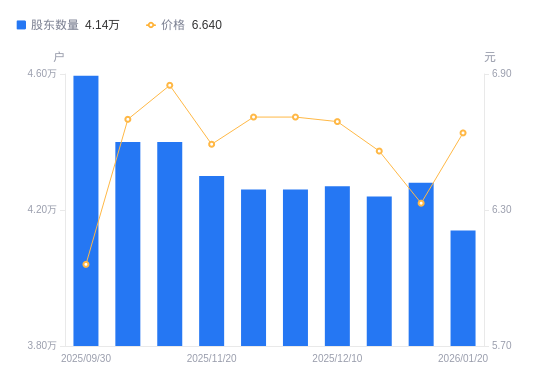 日期A股户数(户)流通A股户均持股数(股)户均持股市值(万元)2026-01-204140010755.357.142025-12-314280010403.546.592025-12-194240010501.696.892025-12-104270010427.916.982025-11-304260010452.387.012025-11-284260010452.387.012025-11-204300010355.156.822025-11-104400010119.816.932025-10-314400010119.816.782025-09-30459489690.775.87