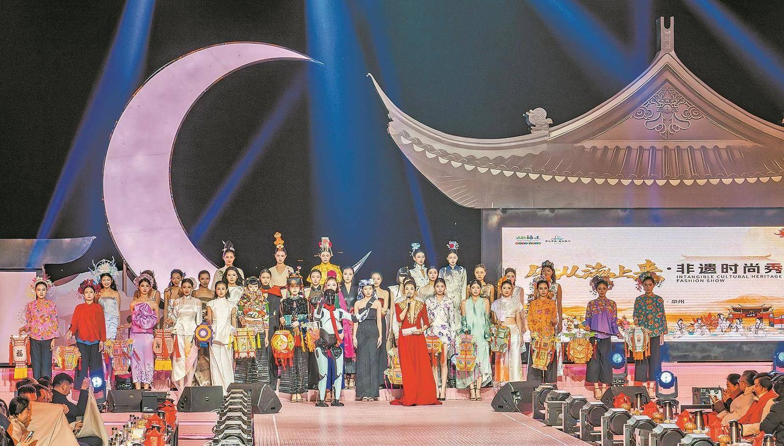 时尚秀分上、下两篇。开场展示宋代迎客礼仪,还原宋人风雅。上篇“海上生明月”以生活化的“海”为主线,通过《月娘月光光》表演唱、南音《庭院七弦响》、情景表演《海的女儿》等节目,融合惠安女织网、蟳埔女簪花、茶道香道等非遗元素,搭配模特走秀,展现人与海的和谐共生。下篇“匠心映月辉”以非遗技艺的“匠”为核心,国潮乐队《奇迹》、南少林武术《少林雄风》、民间舞蹈《双铁尺舞》等节目,将非遗技艺与现代设计结合,凸显力与美的碰撞。尾声,全体模特手持花灯、瓷器等非遗作品返场,与歌曲《泉州人》共鸣,寓意“灯火万家明”,点亮泉州夜空。