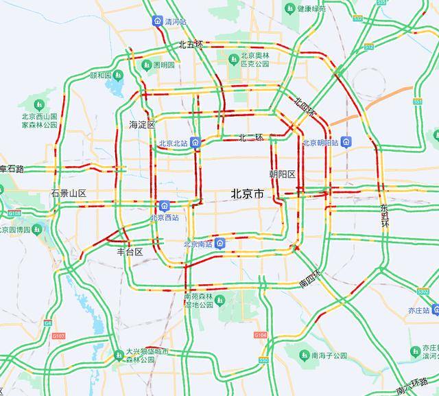 城区东西部二环三环双向、四环五环北向南,北部环路西向东,阜石路、圆明园西路、丰体南路等局部路段出城方向,京藏、京开、京港澳、京通快速等高速公路出京方向部分路段车流集中。航天桥、CBD、月坛、朝阳门等区域交通压力相对较大。