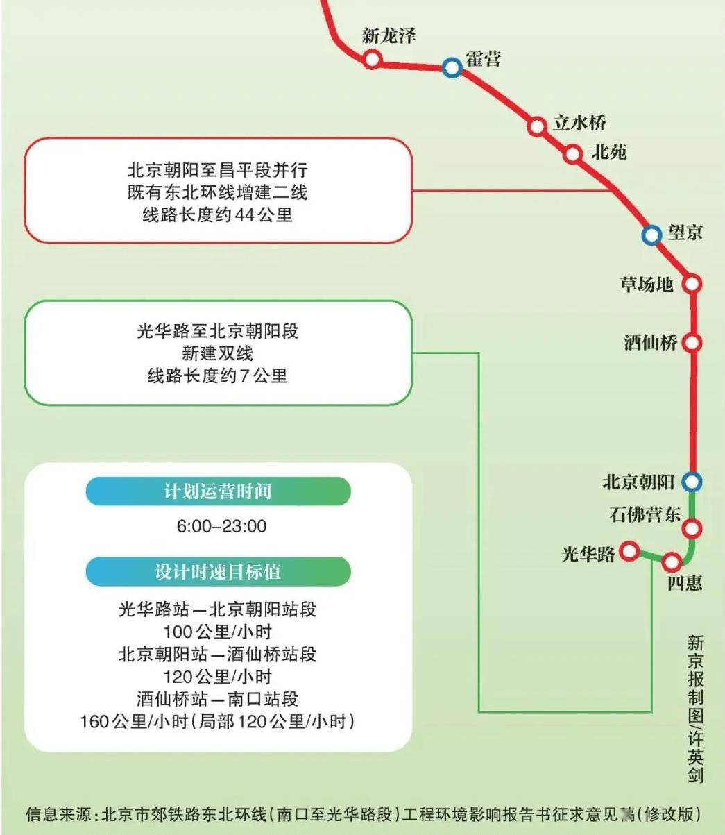 市郊铁路东北环线南起朝阳区光华路、北至昌平区南口,纵贯朝阳、海淀和昌平三区,全长约59公里,共设车站16座,包括新建车站10座、改造既有站6座,并新建车辆基地1座。在回龙观区域将建生命谷站、新龙泽站、霍营站。