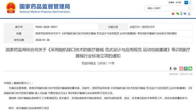 国家药监局批准2项脑机接口相关医疗器械行业标准立项。图源国家药监局官网